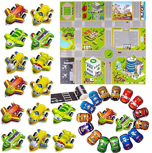 34 Pezzi Mini Auto Aeromobili Set, Mini Tirare Indietro Auto con Tappetino Gioca, Nastro stradale adesivo, Veicoli Giocattolo, Giocattolo Modello Regalo per Bambini Ragazzo Ragazza (Auto Aeromobili)