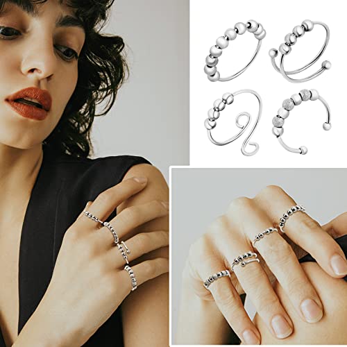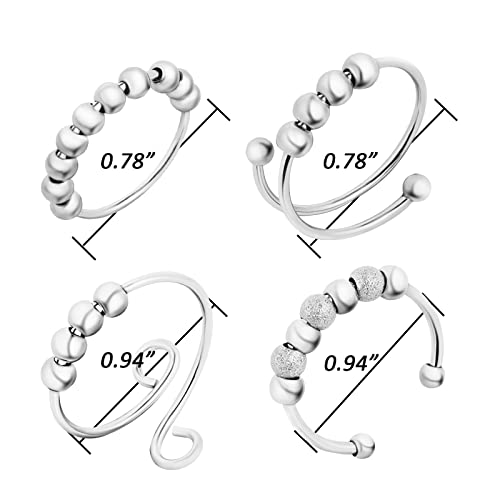 4 Pezzi, Anelli per L'ansia, Anelli per Dita Aperti con Perline, Anelli per Spinner Antistress, Anelli per Spinner Regolabili per Donna Uomo, Argento