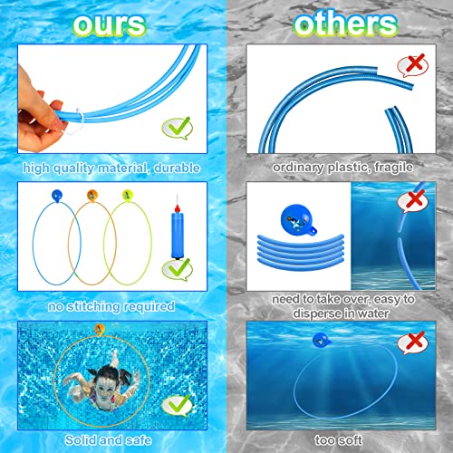 【Facile da trasportare】L'anello da immersione ha un diametro di circa 80 cm e si piega in un piccolo cerchio di circa 26 cm di diametro, facile da trasportare. Include salvagenti gialli, arancioni e azzurri e 3 palloncini. Il pallone è già installato nell'anello da nuoto, anche la pompa è inclusa.