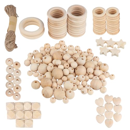 【202 Pcs Perline di legno Set 】 Ottenete 50 Pezzo Perline di legno 1.2cm,50 Pezzo 1.4cm,15 Pezzo 1.7cm,10 Pezzo 2.1cm, 10 Pezzo Perline di legno Cuore, 10 Pezzo Perline di legno ottagonali, 5 Pezzo Perline di legno Stella, 10 Pezzo Perline ovali di legno, 20 Pezzo Anello di legno 3cm, 20 Pezzo 4 cm Anello di legno, 2 Pezzo 5.8cm Anello di legno, 10 Metro Canapa Corda. La quantità e lo stile sufficienti possono soddisfare le vostre esigenze artigianali e il lavoro fai da te.
