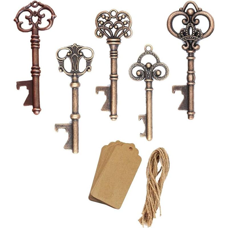 Confezione da 5 apribottiglie in stile classico con 50 carte di carta kraft, indipendentemente dal fatto che il tuo tema sia vintage, classico, rustico o una via di mezzo, questi articoli per feste faranno un regalo affascinante.Confezione da 5 apribottiglie in stile classico con 50 carta kraft carte, che il tuo tema sia vintage, classico, rustico o una via di mezzo, questi articoli per feste faranno un regalo affascinante. Gli apribottiglie chiave sono in lega di metallo, misurano da 2,75" a 3,5" di lunghezza. Ogni chiave è ben fatta, unica e bella. Apribottiglie a forma di chiave in stile vintage color rame, una volta era un apribottiglie, regali di ringraziamento, una chiave per il tuo posto per matrimoni o feste. Queste chiavi sono dotate di una carta di scorta vuota, puoi creare le tue parole di ringraziamento fai-da-te a feste di matrimonio, feste di compleanno, temi, mini regali giocattolo del tesoro. Regalo utile e significativo per i tuoi ospiti, amici, famiglia, la chiave