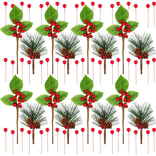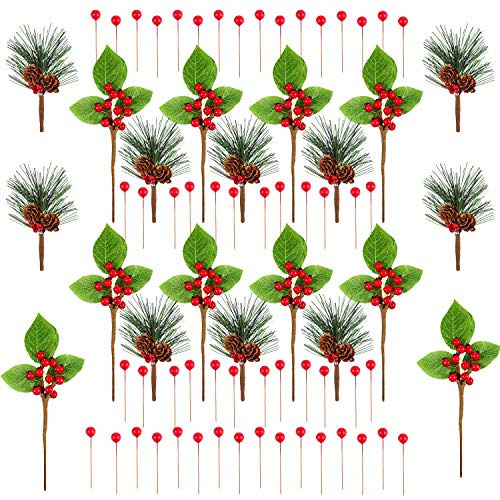 Bastoni del pino artificiale e set rosso della bacca: riceverete 10 pezzi le bastoni artificiali spilla, 10 pezzi bacca rossa bastoni (ogni bastoni ha 12 pezzi bacche rosse con i fogli verdi), e 100 pezzi bacche rosse (1 bacca rossa su 1 stelo), adatto a decorazioni di Natale