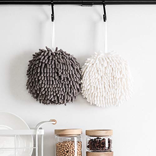 2 Pezzi Asciugamani - Morbido Asciugamano in Ciniglia Appeso in Velluto Corallino per Bagno e Cucina, Palla Asciugamani ad Asciugatura Rapida con Passante per Appendere (Bianco e Grigio)