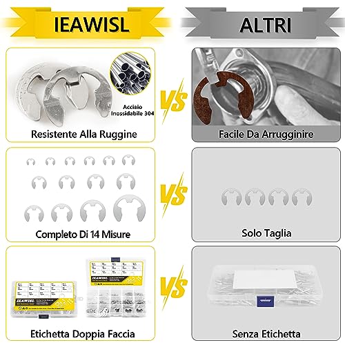 【ANELLI DI FISSAGGIO DI ALTA QUALITÀ】 - Le clip E IEAWISL sono realizzate al 100% in acciaio inossidabile 304, che ha eccellenti caratteristiche antiruggine e resistenza alla corrosione per un uso a lungo termine in qualsiasi ambiente. Gli anelli elastici esterni presentano un design concavo con una superficie liscia e priva di sbavature e sono sufficientemente robusti da fornire una forza di tenuta simile a una molla.