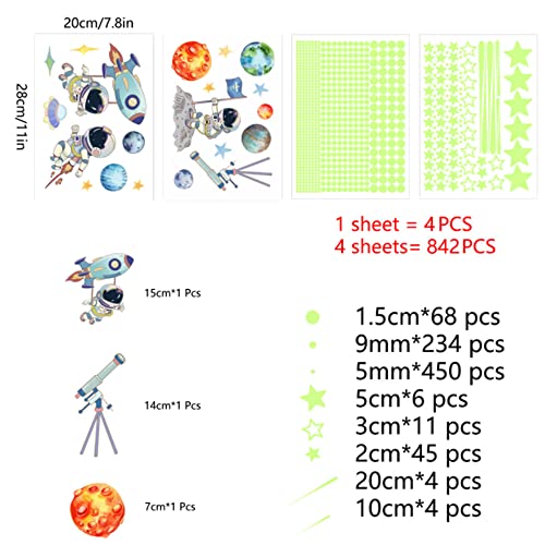 Multi stili: tutti gli 842 pezzi in un unico pacchetto. Stelle luminose autoadesive di alta qualità, astronauti, razzi e pianeti, stelle, meteore. Bellissimi adesivi murali pianeta stelle luminose autoadesive creano un'atmosfera misteriosa dello spazio.