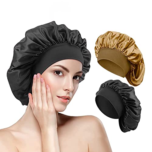 2 Pezzi Berretto da Notte Raso, Banda Larga Seta Cuffia per Capelli Traspirante Dormire Cappello, con 5 tappi doccia trasparenti usa e getta, per Donne Ragazza Capelli Ricci Cura(dorato+nero)