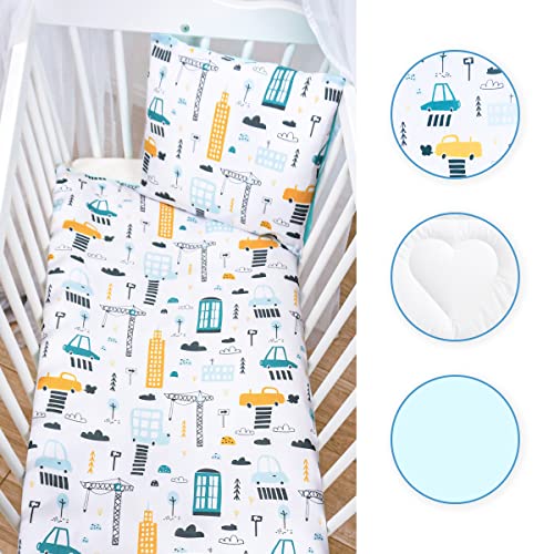 Questo set di biancheria da letto per bambini è stato progettato per adattarsi a culla, culla o carrozzina: copripiumino e copripiumino: 80 x 70 cm, cuscino piatto e federa: 30 x 35 cm