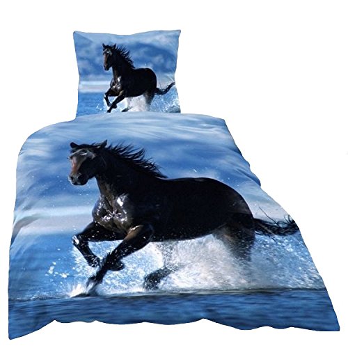 Set di 2 pezzi.Biancheria da letto, 135 x 200 cm, disegno: cavallo nero/blu, in pile termico microfibra, (stampa di alta qualità)