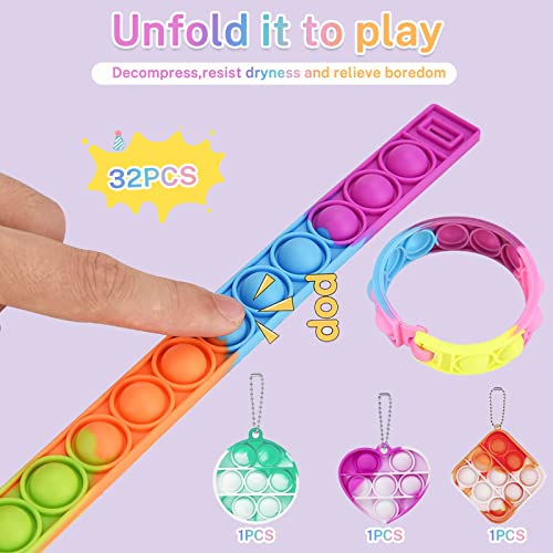 【 Bracciali Pop Up Alla Moda】 Il set di push pop braccialetto include 32 pop it braccialetti pop preformabili, Finger Bubble Music Decompression: 3 pezzi braccialetti pop dal design unico del braccialetto, splendidi colori tie-dye e bottoni dai colori tenui, non solo eleganti, ma possono anche essere usati per alleviare lo stress.
