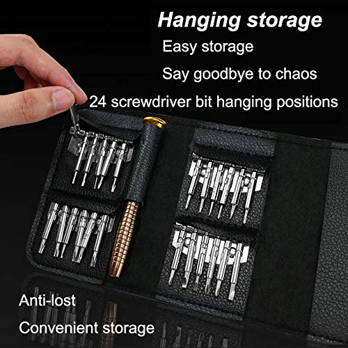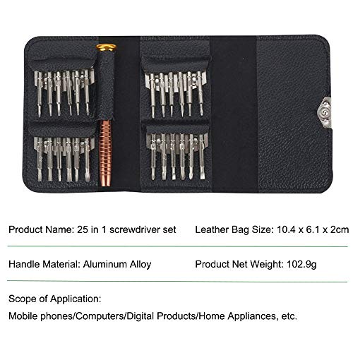 【La confezione include】Set di cacciaviti 25 in 1, [8 * cacciaviti Torx: T2 / T3 / T4 / T5 / T6 / T8 / T10 / T15] [5 * Cacciavite a croce: 1.0 / 1.2 / 1.5 / 2.0 / 3.0] [4 * Cacciavite piatto: 1,0 / 1,5 / 2,0 / 3,0] [2 * Cacciavite a cinque stelle: 0,8 / 1,2] [1 * Cacciavite Y: 0,6] [1 * Cacciavite triangolare: 2,3] [1 * Punta per cacciavite: 0,5] [1 * 2.5 Piastra centrale] [1 * Impugnatura per cacciavite] [1 * Custodia in pelle]