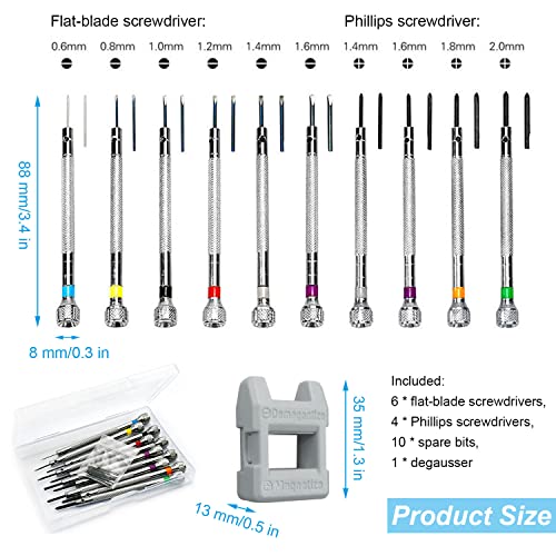 [ Confezione inclusa ] - 6 cacciaviti a testa piatta: 0,6 mm, 0,8 mm, 1,0 mm, 1,2 mm, 1,4 mm, 1,6 mm, 4 cacciaviti Phillips: 1,4 mm, 1,6 mm, 1,8 mm, 2,0 mm, 1 piccolo smagnetizzatore.