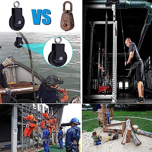 【Materiali di alta qualità】 La puleggia è realizzata in lega di alluminio e rinforzata con cuscinetti in acciaio inossidabile per aumentare la capacità di carico. Le ruote in plastica sono resistenti all'usura e migliorano la scorrevolezza. La staffa a forma di U dell'anello di sollevamento rotondo smerigliato è robusta, resistente alla ruggine e alla corrosione.