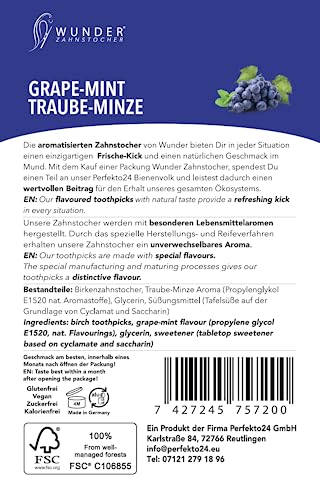 Contenuto della confezione: 100 stuzzicadenti - gusti a scelta: Ananas, Icebonbon, Mela, Mirtillo, Ciliegia - Mentolo, Cannella - Arancia, Uva-Menta
