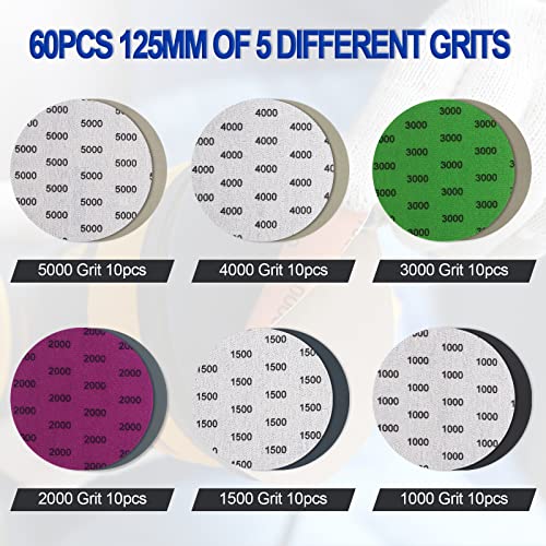 60 pezzi di carta vetrata 125 mm Velcro 1000/1500/2000/3000/4000/5000, dischi abrasivi Jatiler 125 mm Velcro senza foro, set di levigatura in resina epossidica, dischi abrasivi ad acqua per legno,