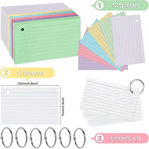 300 Pezzi Cartoncini per Schedario con 6 Anello in Metallo Schede Indice 12,5 x 7,5cm Cartoncini a Righe Carte di Studio Memo Colorate Assortite Schede di Revisione per Vocabolario, Formule,Appunti