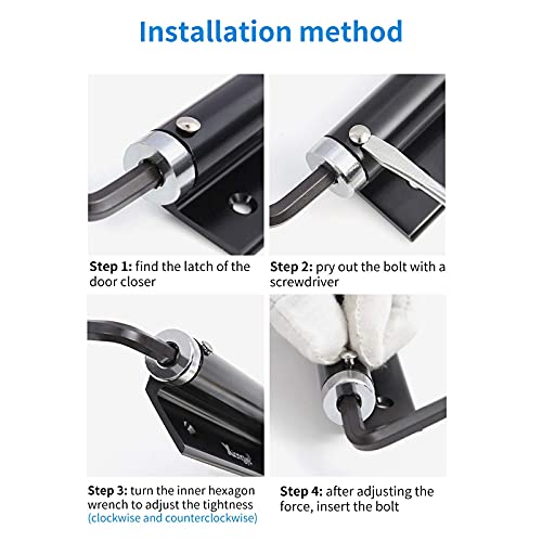 Alta qualità:I chiudiporta automatici per uso domestico hanno proprietà antiossidanti e anticorrosione, sono stabili e resistenti all'usura e possono essere utilizzati come serrature di sicurezza per la maggior parte delle persone.I chiudiporta automatici assicurano che la porta sia aperta o chiusa senza problemi e non si bloccherà. Meccanismo di autoregolazione per soddisfare le tue esigenze.