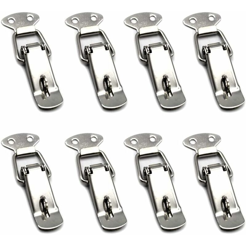 Peso: 0,152 kg Dimensioni: 62,6 * 26,8 mm Colore: come mostrato nell'immagine Materiale: Realizzato in acciaio inossidabile, robusto e durevole, resistente alla ruggine, può durare a lungo. Diametro del foro di montaggio: circa 4,2 mm La confezione include 8 pezzi di chiusura a levetta in acciaio inossidabile. Il set di molle per impieghi gravosi all'interno della chiusura a scatto è comodo da aprire e close.Ideale per casa, ufficio, negozi e altri luoghi.Può essere utilizzato su scatole, cassapanche ecc.
