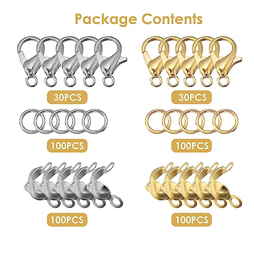 ✨ 【Il set Include】 - 30 fermagli per aragosta d'argento, 30 fermagli per aragosta d'oro, 100 anelli di salto aperti in argento, 100 anelli di salto aperti in oro, 100 punte di perline d'argento, 100 punte di perline d'oro per soddisfare le tue diverse esigenze. Anelli di salto aperti: 5 mm;