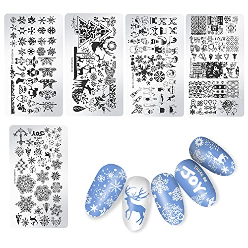 5 Pezzi Christmas Nail Stamping Plate, Natale Fiocco di Neve Dei Cervi Dellalbero Nail Art Unghie Timbro Nail Art Stamp Plates,Set di Natale Nail Art Stamping Stampini per Timbratura Unghie Fai da Te