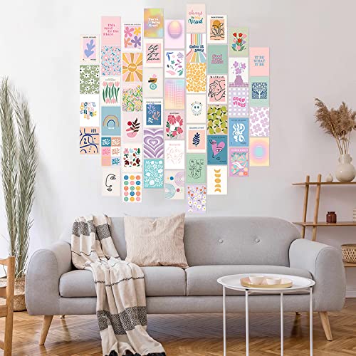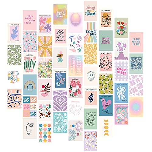 【Kit di Collage Murale Estetico】: Collage estetico di pareti pastello di 50 poster a colori pastello con nastro biadesivo, la dimensione perfetta consente di progettare liberamente il proprio muro fotografico personalizzato.