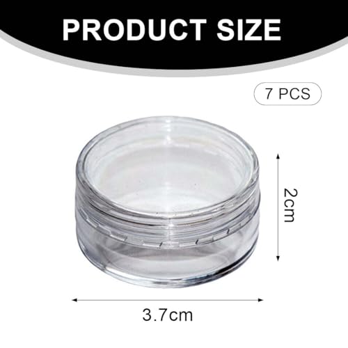 CONTENUTO DELLA CONFEZIONE: Riceverete 7 vasetti di plastica vuoti e trasparenti. Ogni vasetto ha una capacità di 10 g.