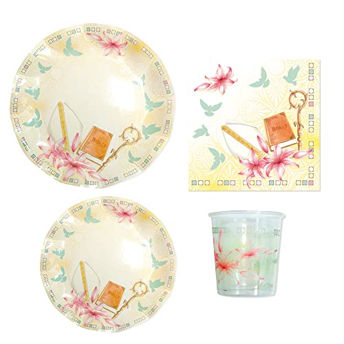 Set 44 pezzi - Kit Coordinato tavola CRESIMA GIGLI - Colore Crema con Bastone, Cappello Vescovale e Bibbia - decoro buffet feste SANTA CRESIMA - 16 piatti + 8 Bicchieri + 20 tovaglioli