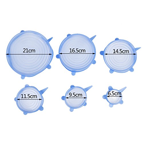 I coperchi di stoccaggio silicone sono disponibili in 6 dimensioni (diametro 6.5cm, diametro 9.5cm, diametro 11.5cm, diametro 14.5cm, diametro 16.5cm, diametro 21cm), per cui v'è sempre una delle dimensioni che prende.