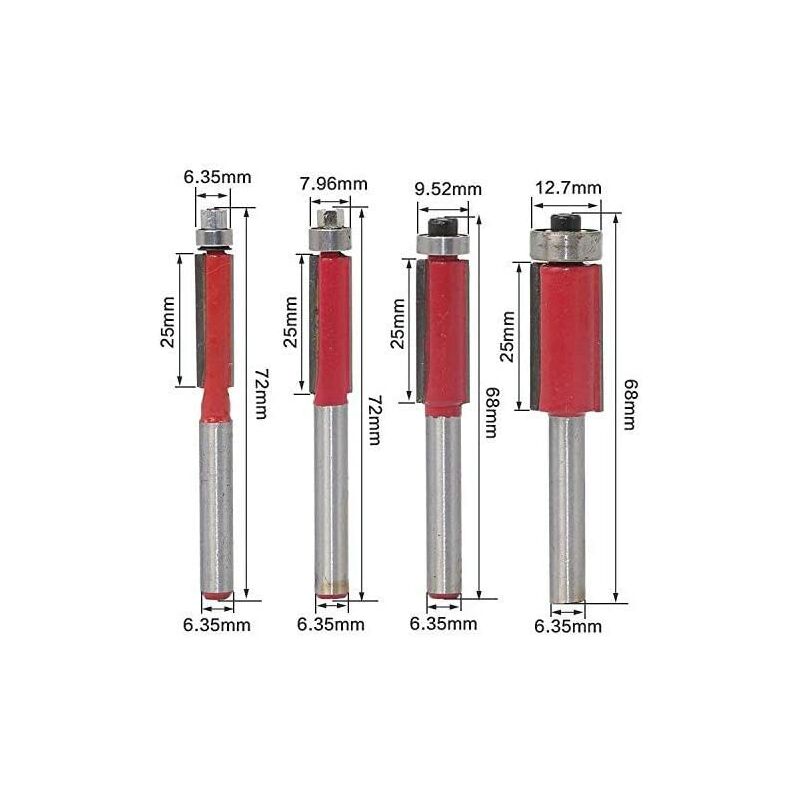 Dimensioni: altezza di taglio: 25 mm (1), diametro di taglio: 6,35 mm, 7,96 mm, 9,52 mm, 12,7 mm (1/4, 5/16, 3/8, 1/2 ) con un gambo superiore: 6,35 mm (1/4). Qualità Premium - Frese in metallo duro e gambo in acciaio. Frese in carburo di tungsteno Premium C3 per prestazioni di lunga durata. Design di taglio a doppio tagliente, eccellente concentricità per tagli veloci, lisci e precisi per laminati e maschere. Costruzione in teflon resistente al calore- up e rivestimento possono prevenire efficacemente rotture o piegamenti in condizioni di lavoro ad alta velocità. p> Utilizzo in fresatrici CNC e altre fresatrici automatiche, nonché fresatrici portatili e da tavolo Ambito di applicazione: legno, legno massello, MDF, acrilico, truciolare, compensato, ecc.