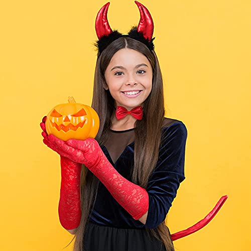 Kit 5 pezzi per costume da diavolo di Halloween: 1 cerchietto rosso con corna da diavolo, 1 papillon rosso brillante, 1 coda rossa brillante, 1 forcina da diavolo e 1 paio di guanti lunghi in pizzo;