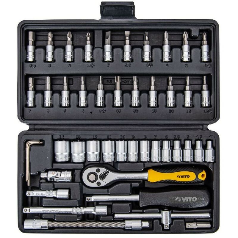 La custodia VITO è resistente alle cadute e agli urti . Utensili di qualità realizzati in cromo vanadio e acciaio inossidabile . Colore: Nero Confezione: Valigetta Accessori: 13 Bussole 1/4': 4 - 4.5 - 5 - 5.5 - 6 - 7 - 8 - 9 - 10 - 11 - 12 - 13 y 14 mm | 1 presa per giunto cardanico | 2 prolunghe rigide: 5-10 cm | 1 prolunga flessibile: 15 cm | 1 barra di scorrimento | 1 cacciavite per punte | 1 chiave a cricchetto 1/4' reversibile | 1 adattatore per punte | 4 chiavi esagonali | 6 bussole esagonali 1/4': H3 - H4 - H5 -H6 - H7 e H8 | 3 Pozidrive 1/4': PZ1 - PZ2 e PZ3 | 3 Piante 1/4': 4 - 5.5 y 7mm | 3 Phillips 1/4': PH1 - PH2 y PH3 | 6 Torx 1/4':T10 - T15 - T20 - T25 - T30 e T40 Confezione: Valigetta rigida Materiale della valigetta: Plastica Materiale degli utensili: Acciaio inossidabile Numero di utensili: 46 pezzi