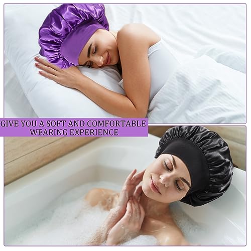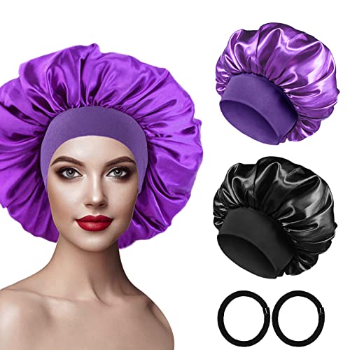 2 Pezzi Cuffia Seta Capelli Ricci, Berretto da Notte Raso Elastico, Cuffia Capelli Ricci Notte con 2 Elastici per Protezione dei Capelli Ricci Lunghi e Corti (Nero, Viola Scuro)