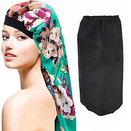 2 Pezzi Cuffia per Dormire Cofano Lungo in Raso Cofano in Seta per Dormire Notte Cappello per Dormire Cofano in Seta Cuffia per Dormire Copricapi Fascia Elastica per Donne e Ragazze (verde,Fiore)-2