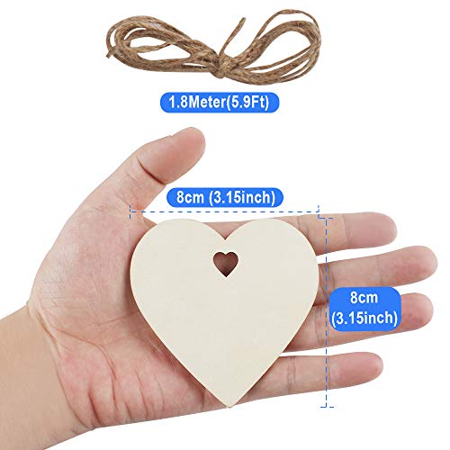 ❥Quello che ottieni - 60 pezzi di ornamenti a cuore in legno e 6 pezzi di filo di iuta. La lunghezza di ogni corda di canapa è di circa 1,8 m, sufficiente per qualsiasi progetto artigianale. Dimensioni del cuore in legno: 8 cm di diametro;