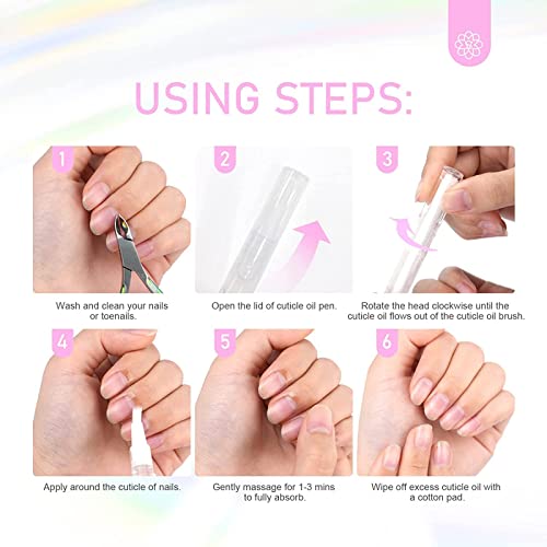 [Olio per la pelle] - Compresi 6 diversi sapori che possono essere utilizzati per spalmare la superficie delle unghie o massaggiare la pelle intorno all'unghia per conferire questa lucentezza e idratare efficacemente. Può essere utilizzato su dita o unghie dei piedi. Può Anche Sbiancare Il tono della pelle. Questo è un ottimo set di olio per cuticole per la crescita delle unghie