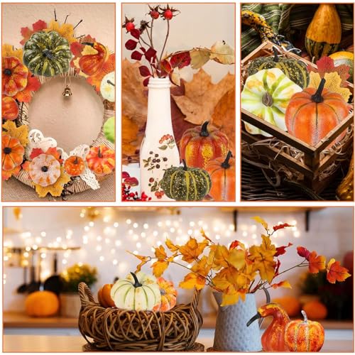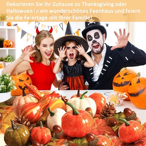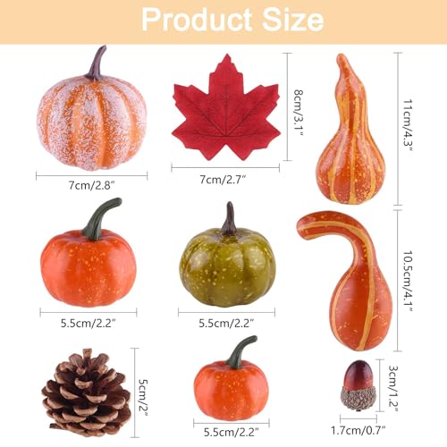 【Set di alta qualità】Il set di decorazioni di zucca di Halloween contiene 70 pezzi di decorazioni autunnali, tra cui 8 zucche artificiali, 50 foglie artificiali, 2 pigne naturali e 10 ghiande. Quantità sufficiente, sufficiente per soddisfare le tue esigenze di decorazione di Halloween e aggiungere colori ricchi, caldi e giocosi ai tuoi eventi autunnali all'aperto!