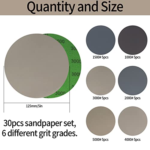 30 Pezzi Dischi Abrasivi Rotondi, Orbitali, ad Acqua o asciutti 125 mm, per Auto, Legno, Vetro, Metallo, Grana 1000/1500/2000/3000/4000/5000