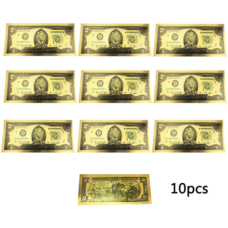 10pcs USA 2 Dollaro In Oro Sventato Platsic Banconota Denaro Falso Negli Stati Uniti DI America Replica Moneta Souvenir Complementi Arredo Casa