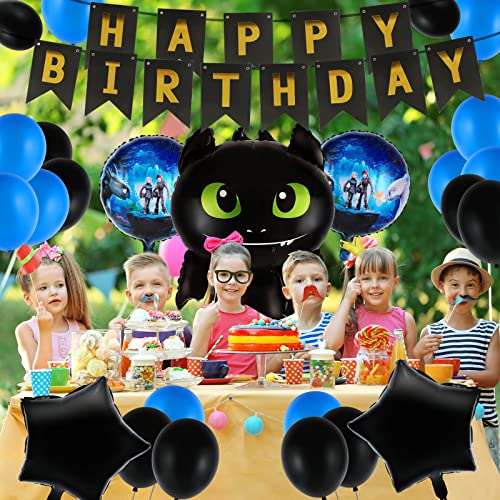 Set di palloncini: Nostro kit di palloncini comprende 1 set di striscioni Happy Birthday, 20 palloncini in lattice, 2 palloncini in alluminio a forma di stella nera, 2 palloncini rotondi a tema e 1 palloncino a forma di drago nero senza denti.