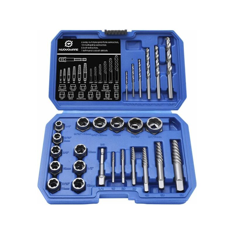 Rimuovi facilmente gli elementi di fissaggio arrugginiti o danneggiati con questo resistente set di estrattori per bulloni da 26 pezzi. Varie specifiche e ampia applicazione, in grado di far fronte a un ambiente di lavoro. Che tu stia lavorando su legno, metallo, plastica o mattoni, la punta inclusa ti consente di praticare fori per i tuoi progetti. Questo kit di rimozione è uno strumento indispensabile per varie applicazioni. Caratteristiche tecniche: Misura dell'estrattore per Dadi Bulloni danneggiati: 1/2, 1/4 3/8, 8 mm, 10 mm, 11 mm, 12 mm, 13 mm, 14 mm, 16 mm, 17 mm, 11/16 19 mm. Misura del kit per estrattori a vite: 1 #, 2 #, 3 #, 4 #, 5 #, 6 #. Misura: punta per trapano HSS: 3/32, 1/8, 5/32, 1/4, 9/32, 3/8 La confezione contiene: Nr. 1 Kit estrattore da 26 pezzi
