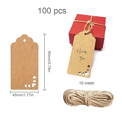 100 Pezzi Etichette in Carta Kraft, Etichette Regalo, Etichette per Regali Artigianali, con Spago in Juta da 10M, Etichette Regalo per Regali, per Regali per San Valentino, Matrimonio e Compleanni