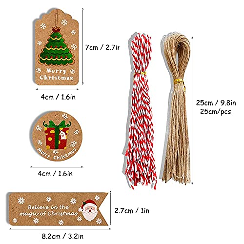 100 Pezzi Etichette Regalo di Natale, Etichette in Carta Kraft, Tag Regalo, Etichette Regalo, 10 Stili, con Spago di Juta e Spago Rosso e Bianco, per Decorazioni Natalizie e Confezioni Regalo