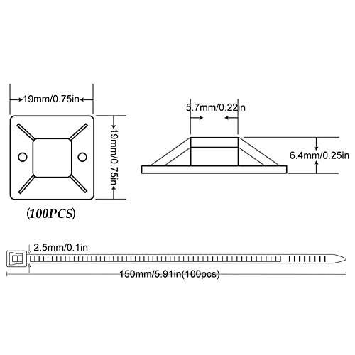 100 Pezzi Fascette Plastica per Cablaggio 150 mm x 2,5 mm Nere +100 Pezzi 20 mm Supporto Autoadesivo Nero, Cable Management, Autobloccanti Fascette Stringicavo per Ufficio e Casa