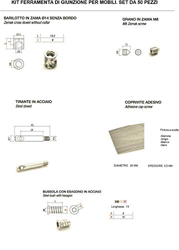KIT 50 PEZZI - Ferramenta GIUNZIONE Mobili - Barilotto 14MM + Grano M8 + Tirante + Coprivite (Coprivite Nero)