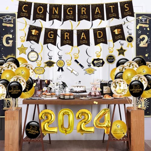 62 Pezzi Festa di Laurea Decorazione, Nero e Oro Congrats Grad Bandierine, Palloncini 2024 di Foil, 24 Dangling Spiral, 30 Decorazioni Laurea Palloncini per la Decorazione di Feste di Laurea