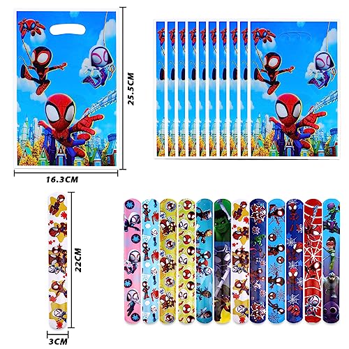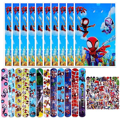 Set da 72 pezzi per feste di compleanno per bambini, 12 braccialetti Spiderman Slap + 50 adesivi supereroi + 10 sacchetti regalo, braccialetti a scatto per bambini