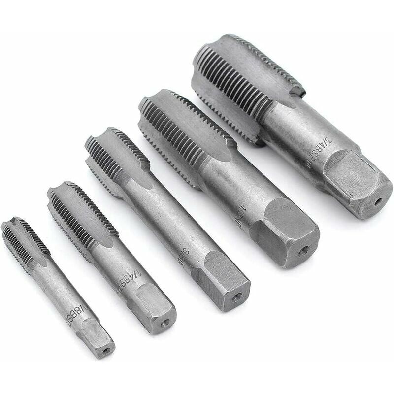 Materiale: questo rubinetto manuale è realizzato in acciaio, resistente. Color argento. Peso G1/8: 21 g. Peso G1/4: 39 g. G3/8: peso 63g. Peso G1/2: 127 g. Peso G3 / 4: 230 g. Tipo di filettatura: BSP (55 gradi). Dimensioni filettatura: G1/8, G1/4, G3/8, G1/2, G3/4. Può forgiare la lavorazione di ghisa, leghe, acciaio, metallo e altri materiali, ha prestazioni elevate e agibilità. Riparare giunti di tubi con tracce di ruggine, rotture, scivolamenti e simili. Ideale per riparazioni auto e macchine in cui è specificata una filettatura metrica. La confezione include: 5 rubinetti BSP. Adatto per la lavorazione di filettature di tubi G1/8, G1/4, G3/8, G1/2, G3/4 BSP.