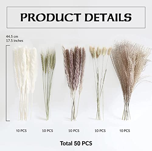 50 Pezzi Fiori Secchi Decorativi,Erba Della Pampas Decorative 45cm,Marrone Erba di Pampa Bianca Fronde soffici,Bouquet di fiori secchi,Erba di Pampa Essiccata Naturale per Matrimoni,Feste