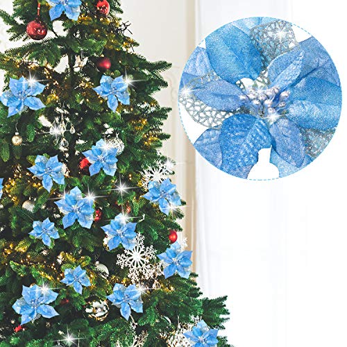 24 Pezzi Fiori di Stella di Natale Poinsettia Glitterati Fiori di Natale Artificiali Glitter Ornamenti di Capodanno per l'Albero di Natale di Nozze (Blu)