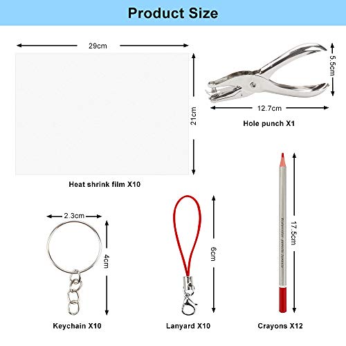43 Pezzi Fogli di Plastica Termoretraibile:12 matite colorate +10 fogli termoretraibile trasparente +10 portachiavi+10 Cordino+perforatore Set di pellicole termoretraibili per per Artigianato Creativo