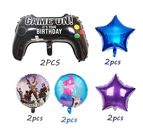 La confezione include: 2 palloncini per joystick, 2 palloncini a stella viola, 2 palloncini a stella blu, 4 palloncini rotondi per videogiochi.